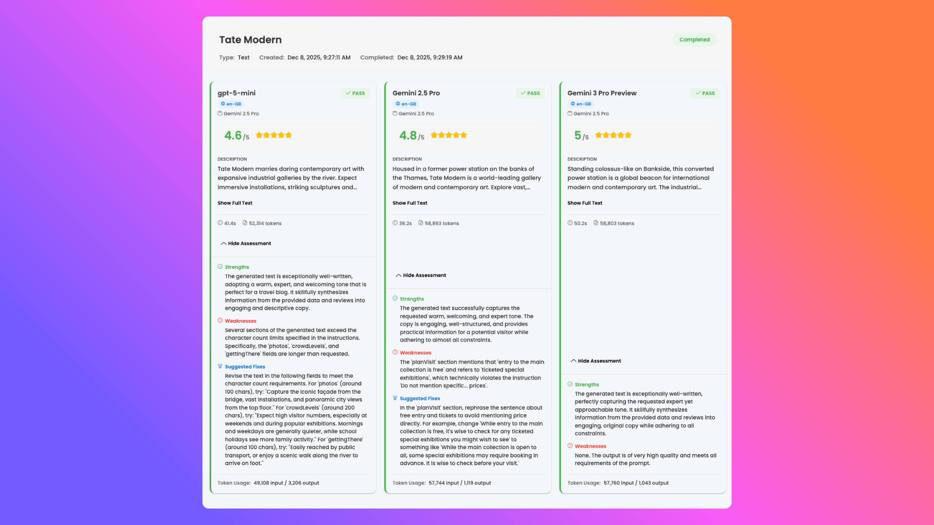 Our goal is to help travel brands sell their destinations at scale without losing the human touch. The Model Checker ensures that 'at scale' never means 'low quality. You remain in complete control, with visibility and scoring on the different model’s outputs. You can see the Judges reasoning for why one model was selected over another and you can edit and manually override anything you’d like to before it goes live.